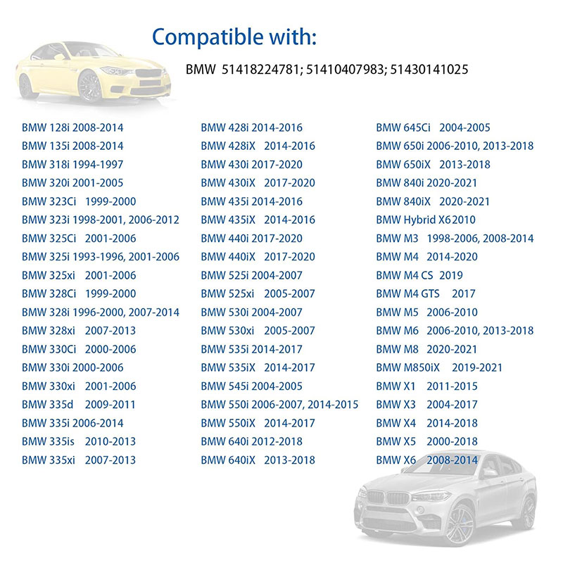 Stok Kodu:QGZ588 OE: 51-41-8-224-781; 51418224781; 51410407983; 51430141025 Malzeme: Yüksek kaliteli naylon malzeme Renk: Gri (özelleştirilebilir seçenekler mevcuttur) Dayanıklılık: Aşınmaya ve çevresel strese karşı yüksek direnç Ambalaj: Özelleştirilebilir paketleme seçenekleri mevcuttur BMW 1, 3, 4, 5, 6, X ve Z Serisi 1992 - Açık için donanım